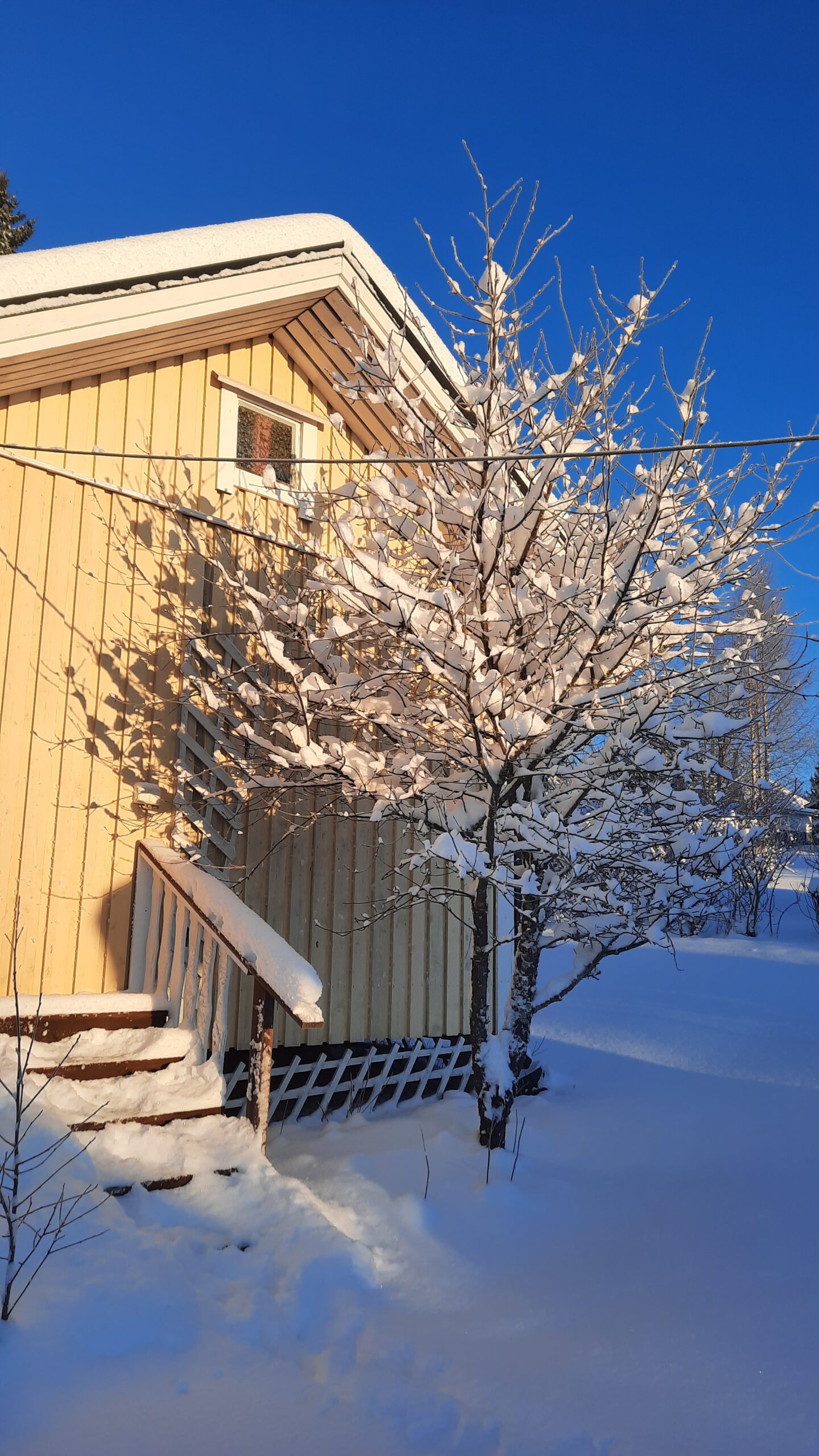 Syksyllä 2025 pihaa uudistettu: Sisääntulo muutettu tontin alalaitaan, josta kulkee polku uuden perennaryhmän viertä mökille. Tällä mökillä on oma autopaikka tontin alalaidassa. Uusi lavakaulusalue on perustettu talon eteen ja marjatarha talon päätyyn metsän laitaan.
