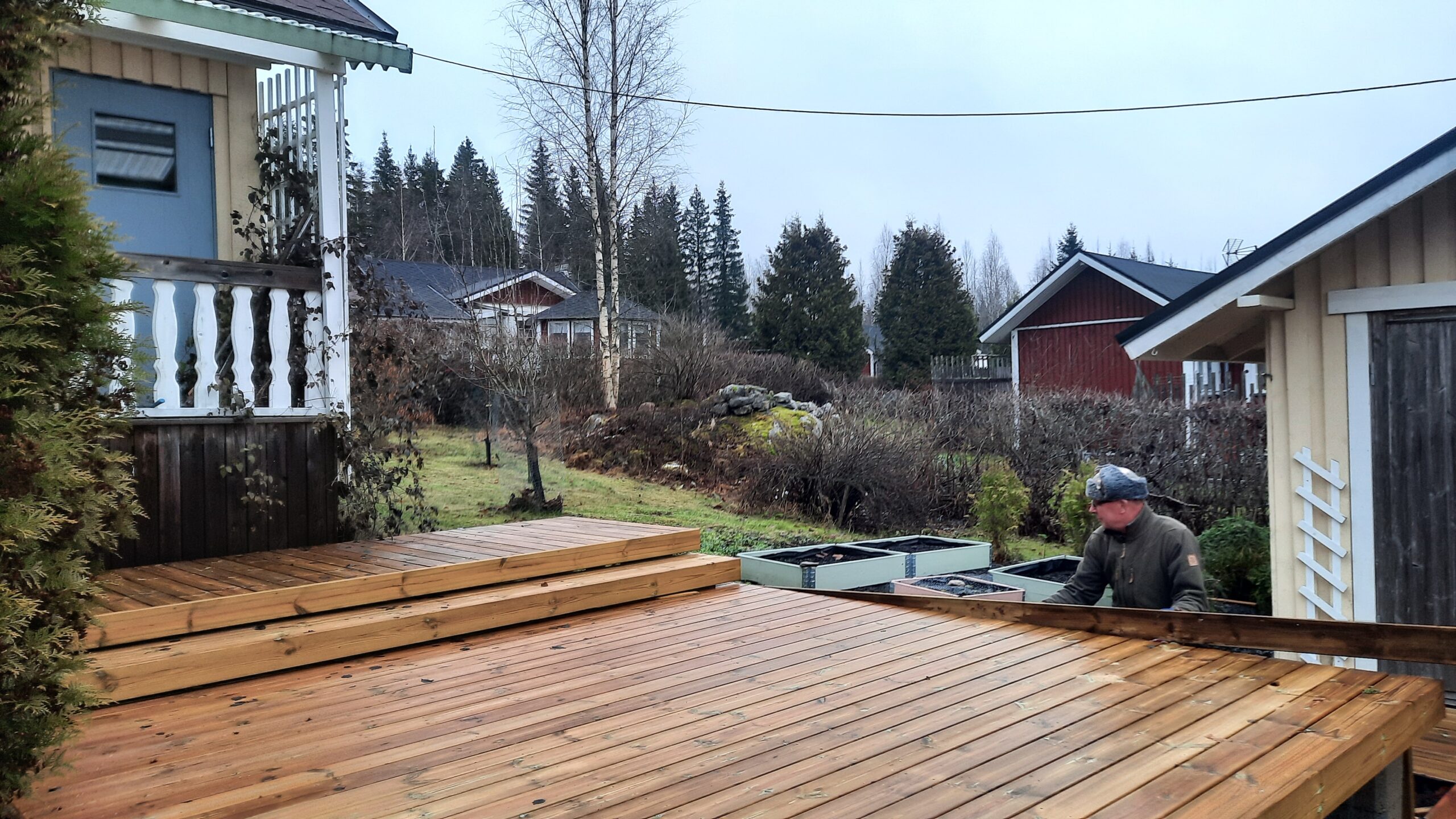 Ihana 2 henk. mökki. Tähän mökkiin on tehty iso terassi auringon puolelle kesällä 2025. Kasvulavoista koostuva viljelypalsta on rakennettu uuden terassin viereen. Pihasauna rakentuu mökin toiseen päätyyn talven 2026 aikana.